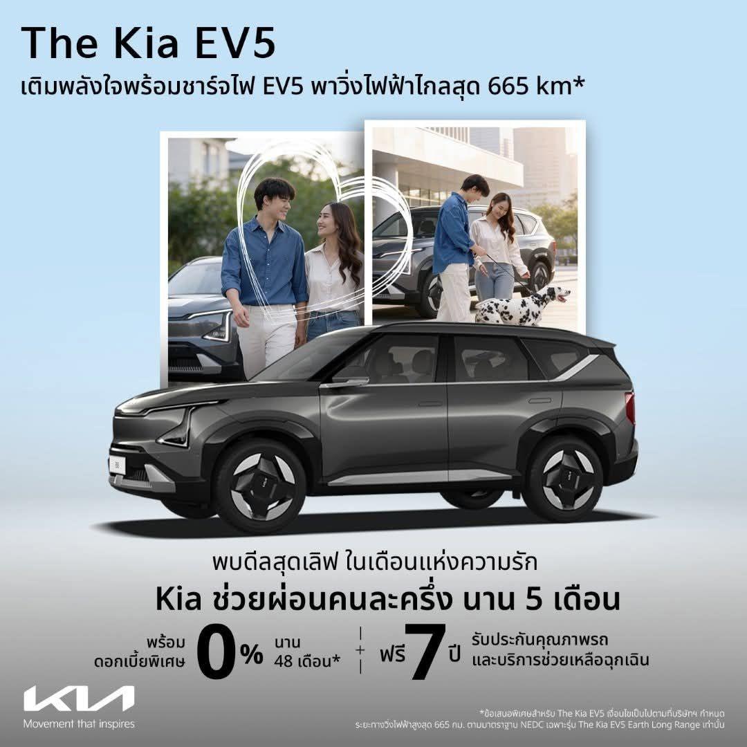ดีลสุดเลิฟ The Kia EV5 ทุกรุ่น "Kia ช่วยผ่อนคนละครึ่ง ในเดือนแห่งความรัก เติมพลังชาร์จไฟ ไปได้ไกล 665 km*